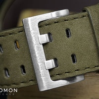 | Khaki green bund-style nubuck strap introduces a unique look |