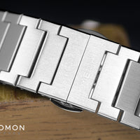 Die polierten und vertikal gebürsteten Oberflächen erstrecken sich bis zum retrograden integrierten Edelstahlarmband mit schmalen Gliedern, die sich eng an das Handgelenk schmiegen und ihm höchsten Komfort bieten. Der attraktive sportliche Look ergänzt die Uhr. Für eine nahtlose Passform ist das konische integrierte Armband mit einer doppelten Faltschließe mit YEMA-Signatur gesichert.